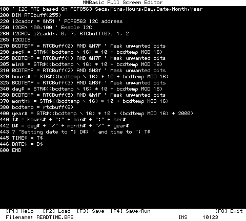 The MMBasic is really great. Brings up memories of my old TRS-80 days. I have a project that the MiniMaximite would be great for. An animatronic sequencer using the I2C bus for the output of servo commands and read the sequences from the SD Ram card. One can hook it upto SD21 easily. However one issue I have is that there is no 'Random' file mode. For example if one has 500 sets of 10 sequences, and at the 500th you want to jump back to the 450th and repeat again you have to close an re-open the file and read through from the start. A Seek statement would work perfectly to move to a particular pyte position in the file. Any suggestions? Take Care Dave Coding Coding Coding.. Keep those keyboards coding.. RAW CODE!!!!! |