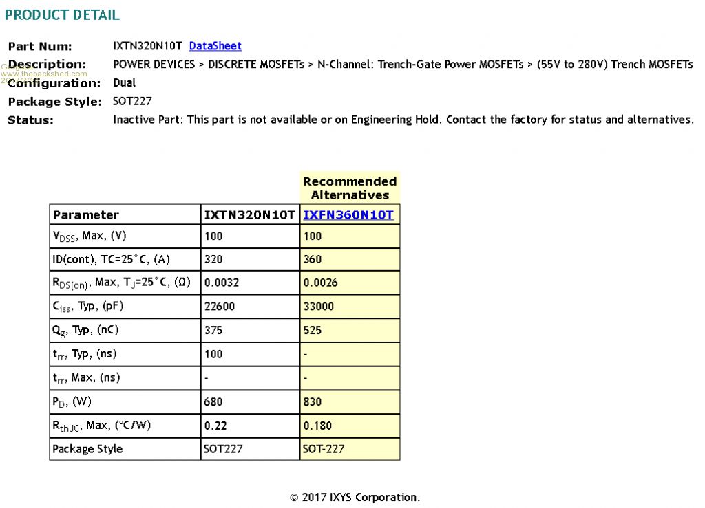 Well, the IXTN320N10T is no longer available from that Verical link that Warpspeed posted, so I will have to buy the IXFN360N10T instead. The only problem with this, is that you have to buy a minimum of 10 @ $16 a pop. I am not that bothered by that, really. The 360 seems to be a better device looking at the data compared to the 320. What I WOULD like to know though, is what Warpspeed thinks of this part as a replacement for the original one he linked to. Here is a GIF comparison from the IXYS website, of the two devices: ![]() From what I can see, the 360 is actually a better device then the 320, so I should be perfectly fine with this one instead, yes? I am just wanting to check that I am not somehow getting the figures wrong or missing something obvious before I buy these devices. The 360 has a 360-Amp chip capability, but the connecting lugs themselves cannot pass more then 200-Amps continuously. The 360 device can handle surge currents up to 900-Amps, 100v S-D voltage, 20v G-D voltage. Avalanche and military rated. Seems like a bloody strong device to me! Smoke makes things work. When the smoke gets out, it stops! |