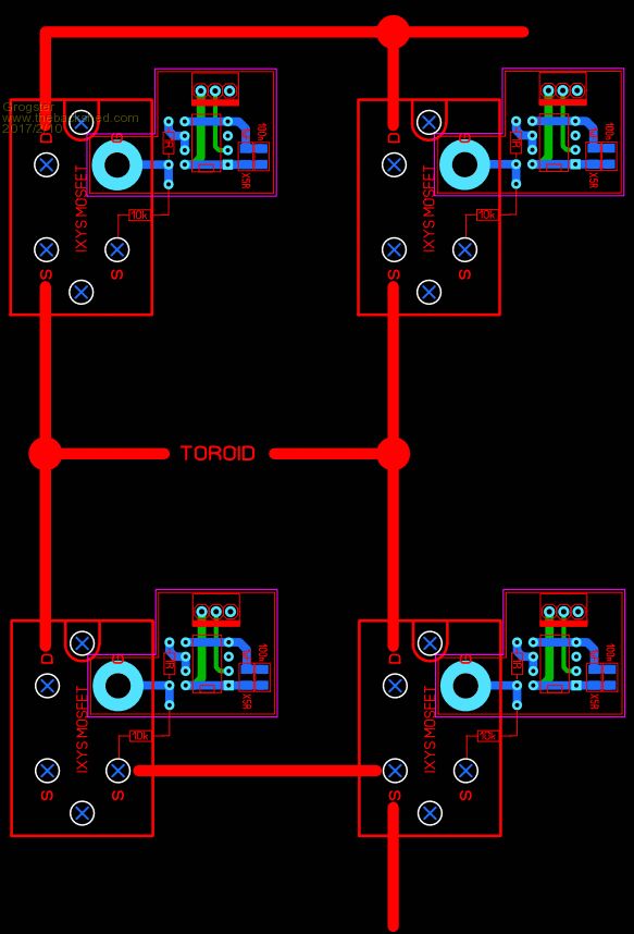 @Grogster, you might want to consider adding snubbers as well to save those MOSFETs from high voltage spikes from the Toroid, or is there protection built into those big FETs? Also you will need a charge pump to trigger the high side MOSFETs. There are only 10 types of people in the world: those who understand binary, and those who don't. |