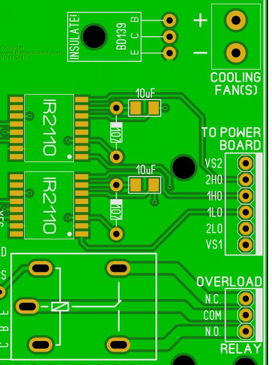 If you already have the dual IR2110 driver board, or can buy it cheap Chinese, might as well use it as it is, and extend the three outputs to each of the the four 4452 boards. The gate driver boards also need to include one of the two source connection screws of the big mosfets, so I would extend the circuit board to include both the gate and source screws. A big solid copper ground area would be good too to tie all the grounds together. ![]() The gate driver board will also need to get its dc power from the IR2110 board, so three connections, and three wires will be required. As drawn, the chip and components will be on the underside of the board. That will reduce the height, and allow room for a big screw terminal electrolytic to mount right over the top of the whole assembly right between the + and - connections to the H bridge. Cheers, Tony. |