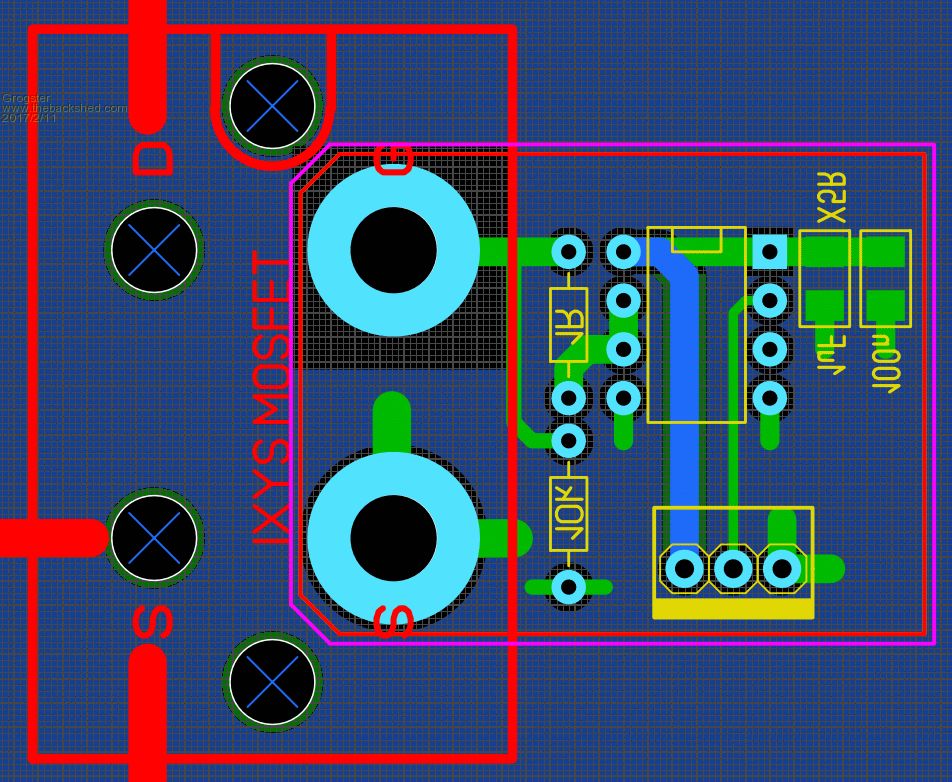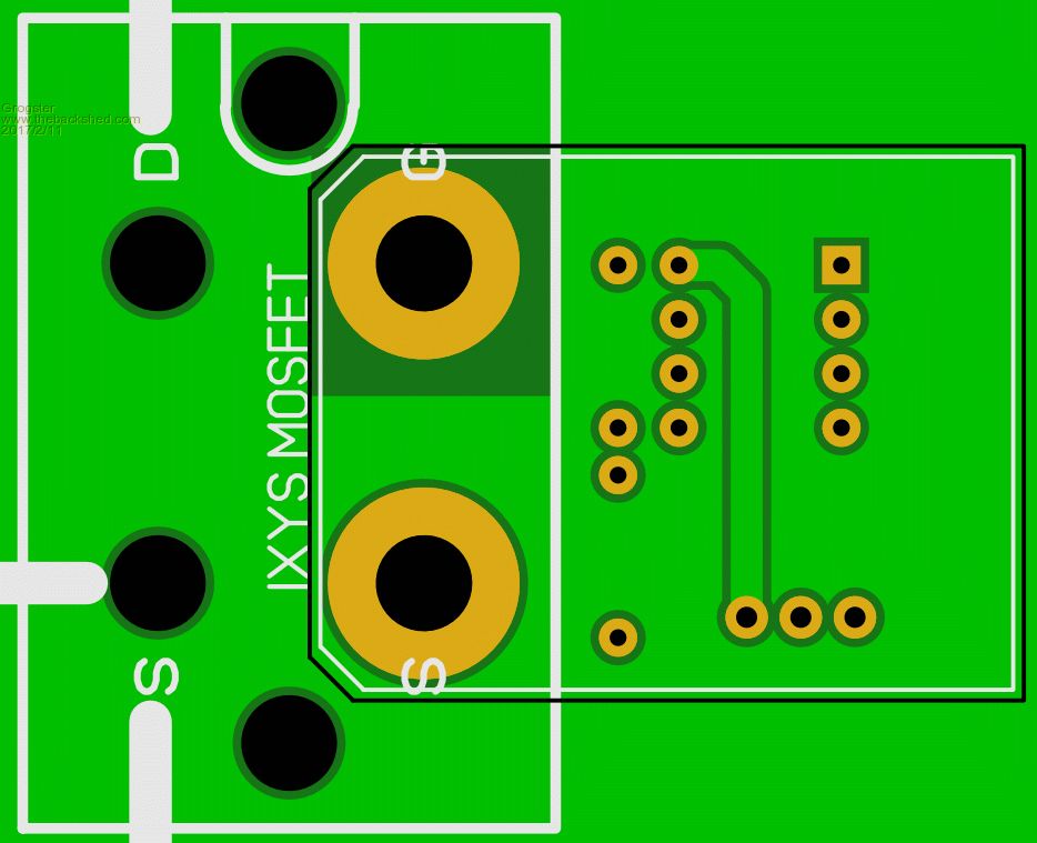 Thanks for that link, Tinker, I will investigate that avenue a little closer, as they are much cheaper. Are they authentic though, that is the question..... I have finished my initial draft of the PCB for these big beefy MOSFET's: ![]() ![]() The small PCB bolts DIRECTLY to the gate terminal on the big MOSFET, and keeps the 4452 within about 5mm of the gate itself. The thick red lines in the bottom image, show the heavy current paths, which would be done using 3mm copper bar that I was going to use in an earlier concept. Just drill holes in the right place, and bolt it all together tightly. EDIT: PCB does not show connection to GND(pins 4 and 5 on the DIL chip) - to be completed..... Smoke makes things work. When the smoke gets out, it stops! |