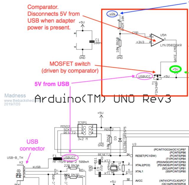 Mark, here is the relevant part of the nano schematic. ![]() It differs from the UNO board. Vin will pass through a linear regulator to produce 5V. If USB 5V is higher + diode drop, then the USB 5V line will power it. The nanoverter uses the 7805 to produce 5V with is fed into the 2 nano boards via pin 27. When I measure this voltage, I see 4.99V according to the Fluke 87. The schematic shows that the USB 5+ supply has to pass through the diode D1 which will take a bit off the top of the USB 5V should it want to conduct into the 5V supply. And it won't because the 4.99V on pin 27 will be more than the USB 5V minus the diode drop. I measure 5.20V on the USB 5V supply. This is from a powered USB hub. On the other end of the diode I measure 4.81V. The voltage drop through this particular diode is 0.4V So we should expect 1/2 of nothing much to happen to the 5V supply to the nanos (on pin 27) when we plug in the USB connector when the nanoverter board is powered up. And this is confirmed when I probe the 5V on the 7805 output and pin 27 on nano2 when I plug the (powered) USB connector into it. A straight line, even when I turn the vertical gain right up on the DSO. Now, both nano boards have a bootloader running at all times. This will detect when you connect to the nano using a serial console and when you first connect, it will force the nano to reboot. Just plugging in a USB cable will not force a reboot, you need to then connect to the nano via a serial console. I have had no problem with this behavior, even when the inverter is running. What happens when I first connect with a running inverter, to nano2 is it stops immediately (just like the EG8010, when you stop it.) No problem. wronger than a phone book full of wrong phone numbers |