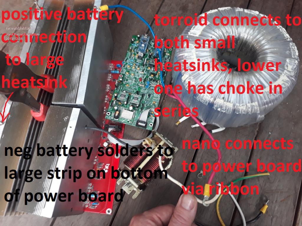 ![]() Wires are different size of course in a proper one, but this is shown to mock up how it goes together. The two wires from the torroid going to the small heat sinks are the primary wires, the lower one needs a choke fitted, (bigger the better) I haven't shown any secondary (240v) connections from the torroid, they will go to the filters and to your output. Pos battery bolts to large heat sink (maybe in two or more places to spread load). Neg battery connects to strip on bottom, you'll need to solder on a few wires and connect them together to spread the load around. Yell out if anything isn't clear Cheers Caveman Mark Off grid eastern Melb |