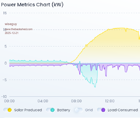 The Sig storage/inverter system has been in & operating, essentially beginning on 18/12/25. I think its only fair to inform now about the negatives of a Sigenergy system and some of its internal workings and secrets. I was checking on our overnight consumption and was alarmed at how high it appeared. First a bold statement. Overnight my 48kWh system appears to self-consume over 4kWh of standby power or close to 400W continuously, nearly 10% of overall capacity.This has nothing to do with phantom static loads of the house it is just what it requires to exist. So in a typical 24 hour cycle it consumes, I estimate over 8kWH of our solar bank consumption. The Sig graphs gave the dirty secret away if you look carefully enough you see it. Overnight there is ~ 650W minimum consumption disguised as house standing load but curiously at ~ 7AM the house minimum standing power remarkably drops to ~ 200W then in the evening around 7pm it increases again back to ~650W. The 7/7 time points align with the beginning of solar start and solar stop for this time of year. I could not understand why the 650W dropped by around 400+ watts before the solar appeared to start in the morning, then I started to realise what was going on & the reverse at dusk. Why was the standing 650W dropping to 200W before the solar appeared to begin? The energy consumption is hidden in the daytime as the standing inverter self consumption appears to be robbed from the solar energy created before it actually reports on what is the resultant solar generation (ie what is left after we remove ~ 400W from the actual solar generation). So a check with Mr Google and the first hit revealed some interesting information. "There was a post in the Sigen app community about a week ago commenting on this. One user suggested 60W for the inverter plus 35W for each 8kWh battery module." I knew there would be some inverter standing loss and 60W sounds slightly plausible albeit on the very light side for a 25kW inverter, the real shocker (pardon the pun) was for the 6 x 8kWH battery stack to be using over 200W continuously over-night. Some other Sig information on the Web mentions BMS and Battery monitoring and balancing power consumption as the cause. Do we need a balancer overnight when not charging & surely monitoring and BMS should draw less than 5W. I believe what is going on is that the 32V to 600V converters running continuously in each module is chewing up the extra 30+ watts per battery module. This tells us that the overall trip from batteryV to mainsV ie inverter idle current is really around 400W. I am unsure if the 35W per module was calculated/derived/assumed from the total energy on the HV "bus" to the inverter, divided by the number of battery modules or if the standing current per battery module also increases proportionally for fewer battery modules ? Sorry for the longish post but if considering a Sig system, be armed with some hidden detail of what is going on internally. Nearly 10% of your battery capacity is not available as it is eaten when the sun isn't shining, and when the sun is shining it takes ~ 4kWH of consumption before you ever see it. Here is a picture of the Sig information graph. The green is battery energy being used, the lower purple is shown as energy for the house. Look at 6am and you will notice a decline of battery energy supplied to zero at about 7:30 as the solar is now reported to have started generation. The decline in battery energy is caused by the true beginning of solar energy from the panels from ~ 6:am. The 300W house consumption shown was a snapshot of the graph during a house minimum load during solar generation. Sig information graph ![]() Zoomed in: The house load (violet) & battery energy required (green) magically drops from 650W to ~ 200W before solar supposedly "started"! ![]() Battery was fully charged before 11am. Edited 2025-12-21 10:29 by wiseguy If at first you dont succeed, I suggest you avoid sky diving.... Cheers Mike |