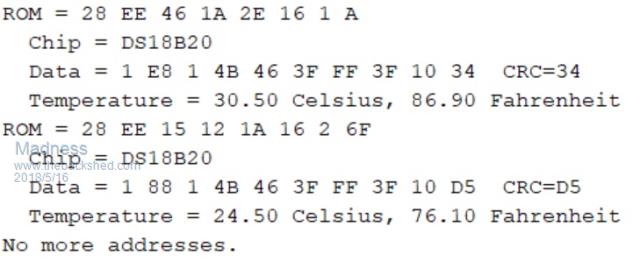 Serial.print(" Data = "); Serial.print(present, HEX); Serial.print(" "); for ( i = 0; i < 9; i++) { // we need 9 bytes data = ds.read(); Serial.print(data, HEX); Serial.print(" "); } Serial.print(" CRC="); Serial.print(OneWire::crc8(data, 8), HEX); Serial.println();