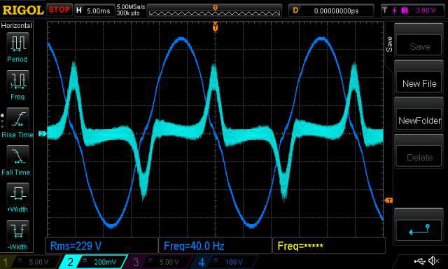 I think you better have a copy of the firmware that operates as a variac. The SPWM amplitude is controlled by a pot. I think it soft starts up to the pot setting and there it remains. You can then immediately command a change in AC voltage via the pot. No closed loop control. pot setting = PWM duty width This code was fun to play with. I always found I could make the toroid growl with sudden increases in AC output via twisting the pot. Slow changes to increase voltage made far quieter grunt. Always there was no grunt when reducing AC voltage by twisting the pot the other way. Fast or slow reductions were quiet. From this play, I found that the grunt sounds were proportional to rate of increase of output voltage WHEN NEAR SATURATION. IF the AC voltage was only 1/2 max. or maybe 120V no grunt even with fast increases that stop at levels below the start of saturation. This is from testing years ago so my memory will not be great. I can only relate experience with Aerosharp 1.5kW and 3kW toroids that use the factory wound 240V secondary winding and my roughly wound primary. At 240V AC RMS output on the secondary, there is some but not a lot of evidence of a saturating core. It goes like 100V - none 200V - none 220V - a tiny bit 240V - a small bit (a slight hum at steady state) 250V - 2x that (clearly a hum now) 260V - 4x or more as at 240V (good and solid hum from the toriod) Something like that. Saturation was detected by me from observing primary current peaks. So at 220V AC I could just see the small current peaks at AC output zero crossings. here is current and AC voltage output at 40Hz and 240V AC output This is an extreme example. The toroid core/secondary winding is not designed for this combination since it clearly is saturating. It's not going to blow up or burn out it will just be inefficient. ![]() The earlier code (when changing from "stop" to "run") will terminate the soft stop ramp down and reset the code to initial conditions required for a soft start and then start ramping up. The ramp position is set to zero when initialised. This code execution will occur at the time the run/stop signal is checked and this check happens at 100Hz, every zero crossing. Think of it as a clock, ticking at 20kHz, making a PWM pulse. This is the only interrupt and so it is never interrupted by other code. It always will be executed, with very little time jitter (+/- a few ns) and make a pulse. In the spare time after the interrupt has completed which is about 80% of cpu time, the code can do what else is needed such as respond to a zero crossing. The zero crossing event triggers the PID closed loop code to run as well as the checking of the run/stop signal. wronger than a phone book full of wrong phone numbers |