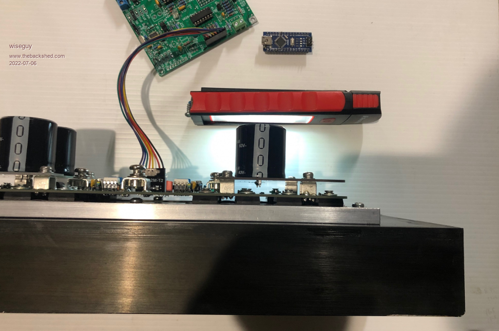 Thanks Peter that will be fine. My rethink on how best to avoid flux wander is to have balanced 360 degree cycles. I know there will need be a step changes during ramp up etc but after an increment step the increased amount of the next 180 degrees after the step change should be reflected in the next/following 180 degrees, so I am very happy with 50 Hz control & steps. I am aware that corrections to output loads etc may be slightly slower but I am happy to accept that. I have also decided that if this experiment does not work/improve the grunt I will just go with the slower ramp time and be happy with the quieter grunt. Two pictures of the new design with 16 HY5608s ready to detonate...... 8010 Control PCB with 8way connecting cable. ![]() Vertical shot to see the multiple transistor sandwich. ![]() If at first you dont succeed, I suggest you avoid sky diving.... Cheers Mike |