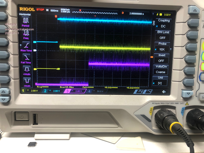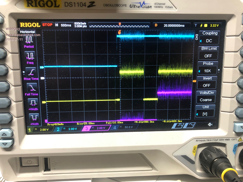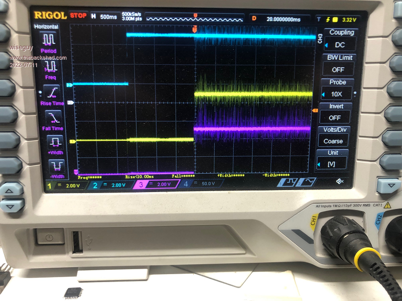 I have rebuilt a new power PCB but before I hooked it up to the Nano I wanted to run some testing as I was sure there were some issues with D5, the enable for the outputs. The transformer is ~31.2V at ~235V out. It was intended to still provide 235V at 44V which is the low voltage cut out. If I did it again I would probably go for ~33V and be happy with a bit of droop below 46V as it approaches 44V. The following CRO pictures tell an interesting story (apart from my lousy/noisy ground). The Purple trace is the D8 input that tells the Nano "please start" The Yellow trace is D5 & its supposed to go High at ramp up start after D8 has been told "go". The Blue trace is just the 5V coming to life after turn on, for relativity. This is the 1000 step code as received ![]() This is the 1000 step code with SST = 100 Note D5 went high for 1 second immediately the 5V rail went active & before D8 was told to "go" ![]() This is the 1000 step code with SST = 200 Note D5 went high after Power up and just stayed high ![]() I did say yesterday that it behaved as though D5 was being enabled before the start command. Poida this is why we pay you the big bucks, to solve all the weird problems ![]() Its probably caused by a missing comma or = sign or something simple but the results are a bit bizzare. Thanks for your comments on what I did and agreeing it should have had the effect I wanted - it looked reasonable to me but I am software challenged and software is easily broken..... The really sad part is that the middle picture with the premature enablation (is that a word ?) is the one that doesn't grunt and starts real nice ![]() Edited 2022-07-12 00:31 by wiseguy If at first you dont succeed, I suggest you avoid sky diving.... Cheers Mike |