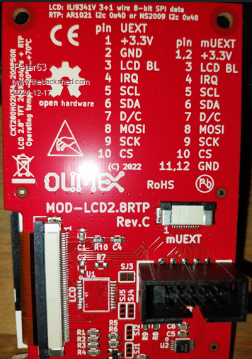 @Peter63 I got this from the website: - LCD uses SPI, touch uses I2C or UART - Touch is handled by NS2009 or AR1021 depending on hardware revision https://www.olimex.com/Products/Modules/LCD/MOD-LCD2-8RTP/open-source-hardware https://github.com/OLIMEX/MOD-LCD2.8RTP/blob/master/README.md 5 - SCL 6 - SDA I2C pins used for touch component But the whole thing would be better off in its own thread. Matthias Edited 2024-12-17 02:44 by homa |