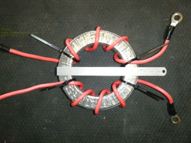 So its been a while since my last post here, there was only a little progress on my monster inverter since. Madness posted a picture of his ring core ferrite choke recently, the one I'd ordered (its bigger)ferrite ring core has arrived and I tested it on my 4 Mosfet test inverter. Well, its certainly quiet, none of that annoying buzz one gets from the E-core chokes. And there is heaps more room for the cable to wrap around, 8 turns are doable. So I wrapped 8 turns (of 6mm sq) on and started testing. The trace on the scope looks good, just a small wiggle at the zero crossing line with a 1200W load (all my test toroid can handle with its 4 x HY4008 Mosfets). Next I replaced the 8 turns with 2 x 4 turns like this: ![]() The idle current is exactly the same as with 8 straight turns, the CRO trace the same too. So this is the way I'm going to wind my ring core choke, using 4 x 20mm sq cable in parallel for each 4 turn wind. Doing it this way is easier with my placement of the stacked core toroid and the Mosfets on the big heat sink. I can use the individual connections of the chokes to replace extra heavy cable links I had to use before. Something I found out about these chokes: more turns = < idle current (there is a practical limit here). Also: bigger core cross section = < idle current. To test the latter I had the E-core everybody uses which is 540mm sq. and a larger E core with 850mm sq and The new ring core with 418mm sq. The larger E core with 4 turns still had a lower idle current than the ring core with 8 turns - 146.5 versus 172.5mA. So, if one wishes to push the envelope here I would suggest a double stack ferrite ring core. This would cost almost the same as the 540mm sq E core but be a lot easier to wind on. On another matter, I think I found one reason why I managed to blow so many HY4008 chips. The last 'accident' was a gentle affair, just the top of the chip popped off rather than the usual violent explosion. ![]() One can make out the place where one of the two tiny wires that connect the source leg to the substrate was. These 2 wires were no more than 0.5mm in diameter and they are about 5mm long each. Passing 200A through this is a big ask, even if they were silver wires. So I think that 200A rating is perhaps with an infinite size water cooled heat sink . My problem was the Mosfets had to be insulated from the heat sink, I used those silicon pads with heat sink compound. When running my test inverter for a while on its max load I measured a temperature difference of almost 10 degrees between the black Mosfet back and the heat sink. So I now think that sudden extra loads create more heat that can be moved quickly through the silicon washer, the chip overheats and - pop. What I will do to get around this - I still prefer an outside, non 'life' heatsink - is to mount the Mosfets onto my sub heatsinks straight on. As there are 4 sub heat sinks there is electrically no problem as long as each of the sub heat sinks is insulated from the main heat sink. The heat transfer area is now about 10 times bigger so the insulator should transfer it better too. I'm using that thin double sided sticky tape, as used to stick heat sinks onto CPU chips. That tape comes in many sizes and thicknesses, I picked the thinnest tape I could find which is 0.06mm. Its quite economical even in the 50m roll it comes. Best of all, it easily withstood my 90V DC test and its rated to 120 degrees C. Time will tell if its a success. Klaus |