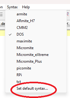 Did you add the quotes to the 'Path to external program'? '%mmepath%MMBasic.exe' Getting the system32 starting folder when you 'open with' from Windows Explorer demonstrates the problem I was having. Windows thinks it knows best and can be difficult to tame sometimes. That's why I went with the batch file. To change the default syntax, select it in the Syntax menu then select the last entry: Set default syntax... ![]() I must put a popup to acknowledge the change. I will update the version of MMBasic I include - thanks. VK7JH MMedit |