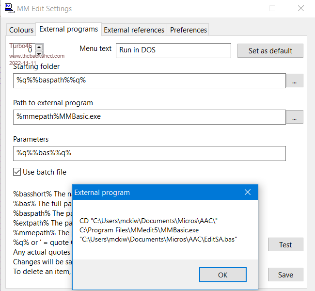 No Bill, the original DOS settings should work without any changes other than ticking the 'use batch' box. You can now use a single quote instead of %q% for the double quote place holders. Either way will work. The single quote is easier to see whats happening. The 'test' button will show you what the filled out commands look like for the current bas file. Can you show me what your settings are. Either a screen dump of the setting page or the Ext0 = line from your MMEdit.inf Jim VK7JH MMedit |