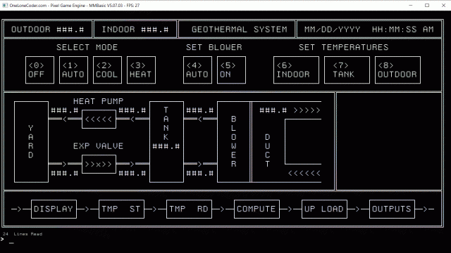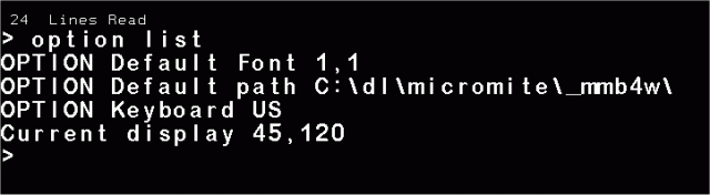 Puzzled by need to set first line printed with TEXT at other than 1 in order not to have top lines scrolled off. For Paul_L's display using PC graphics drawing characters, when using scale to make the display as large as he wants, I have to set the first line at 7 when scale is 2, or at 13 when scale is 1. The program sets mode 16 and font 4. Display with scale=2, first line is 7 (this is the way Paul wants it to look): ![]() Display with scale=1, first line is 13: ![]() Here's what it looks like with scale=2, first line = 1 (it's similarly off the screen with scale=1 and first line = 1): ![]() Here's the code: dim string sLine(40) length 80 dim integer nLines,fh, fw, ln=7, scale=2 mode 16 font 4 fh=mm.fontheight: fw=mm.fontwidth if scale=1 then ln=13 'ln=1 cls open "\dl\micromite\_mmb4w\geo\g9_display.txt" for input as #1 do while not EOF(#1) nLines=nLines+1 line input #1, sLine(nLines) text 0,ln*fh*scale,sLine(nLines),,,scale ln=ln+1 loop close #1 text 0,ln*fh*scale,"" ' set cursor print nLines," Lines Read" end Here's the file I'm reading zipped: g9_display.zip Here's the result of OPTION LIST: ![]() If it's significant, my display resolution is 1600x900. The issue is similar if I use mode 15 and font 1. I don't see what I'm doing wrong. ~ Edited 2022-07-05 00:48 by lizby PicoMite, Armmite F4, SensorKits, MMBasic Hardware, Games, etc. on FOTS |