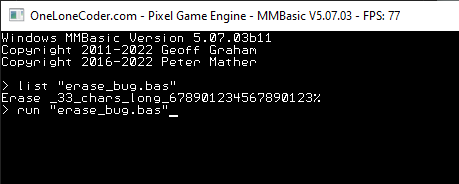 Thank you Peter, you've fixed that, but a recent addition to the MMB4L firmware test-suite has revealed another issue: ![]() Running this will immediately crash-out MMB4W, note that it is crashing out whilst loading the program into the program memory not whilst it is interpreting it. I believe it should instead be generating the error "Name too long" during interpretation. You might want to check the PicoMite too, I haven't got my test framework running on that yet ... I will need to customize the firmware. Best wishes, Tom Edited 2022-10-05 01:06 by thwill MMBasic for Linux, Game*Mite, CMM2 Welcome Tape, Creaky old text adventures |