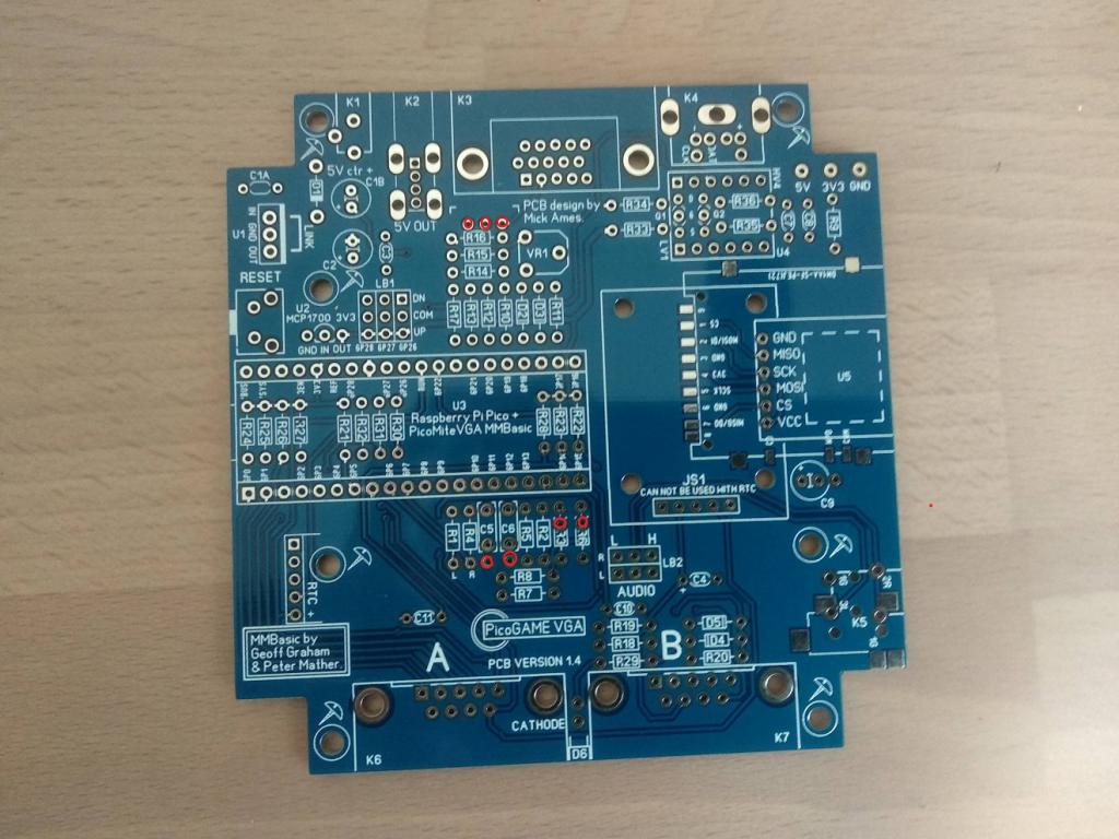 Excellent! :) You'll be pleased to know that I've found some stray silk screening on the bottom of the 1.4 boards. It's about using the GP15 mode control, which isn't there now. :) It's not particularly easy to see the back text on the setup I normally use. It makes it a bit too easy to miss things. I really must fix that. lol Here's the version 1.4 PicoGame test program: BASfiles.zip Like my hardware, it keeps changing a bit... Mick Zilog Inside! nascom.info for Nascom & Gemini Preliminary MMBasic docs & my PCB designs |