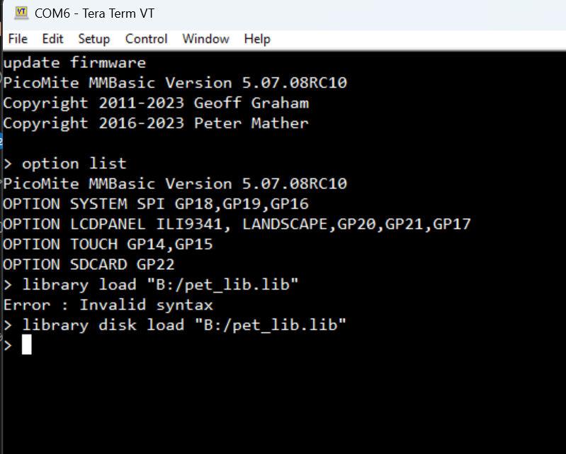 MMBasic (non VGA) crashes through LIBRARY DISK LOAD even there is nothing configured freshly unpacked, No SPI no SD Card etc. configured. 'no comment |