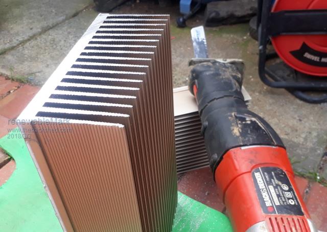 Got to the heatsink part. I was going to use the compound mitre saw, but the blades were $90 for a metal one, and probably won't use it again, so went with the scumbag option. After stuffing around I really wish I just got the metal blade for the saw. The cross cut worked out really well, but cutting the fins was a bit of a bugger. They need a bit of cleaning up and getting rid of any loose bits, might pressure wash it after filing. ![]() ![]() ![]() Cheers Caveman Mark Off grid eastern Melb |