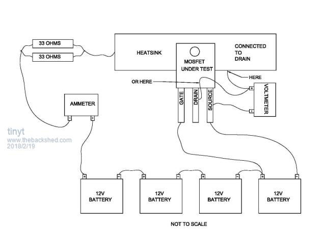 OK boys, had another crack at the fet testing Still using 48v bank, did the wiring as per TinyT's diagram. Only change is I used more resisters 4x 10ohm in parallel then in series with another lot of 4 in parallel giving me 9.6 odd amps. So @ 48v I am getting 28.7mv @9.58A I have done 8 so far and all look similar. Do those figures look right? Cheers Caveman Mark Off grid eastern Melb |