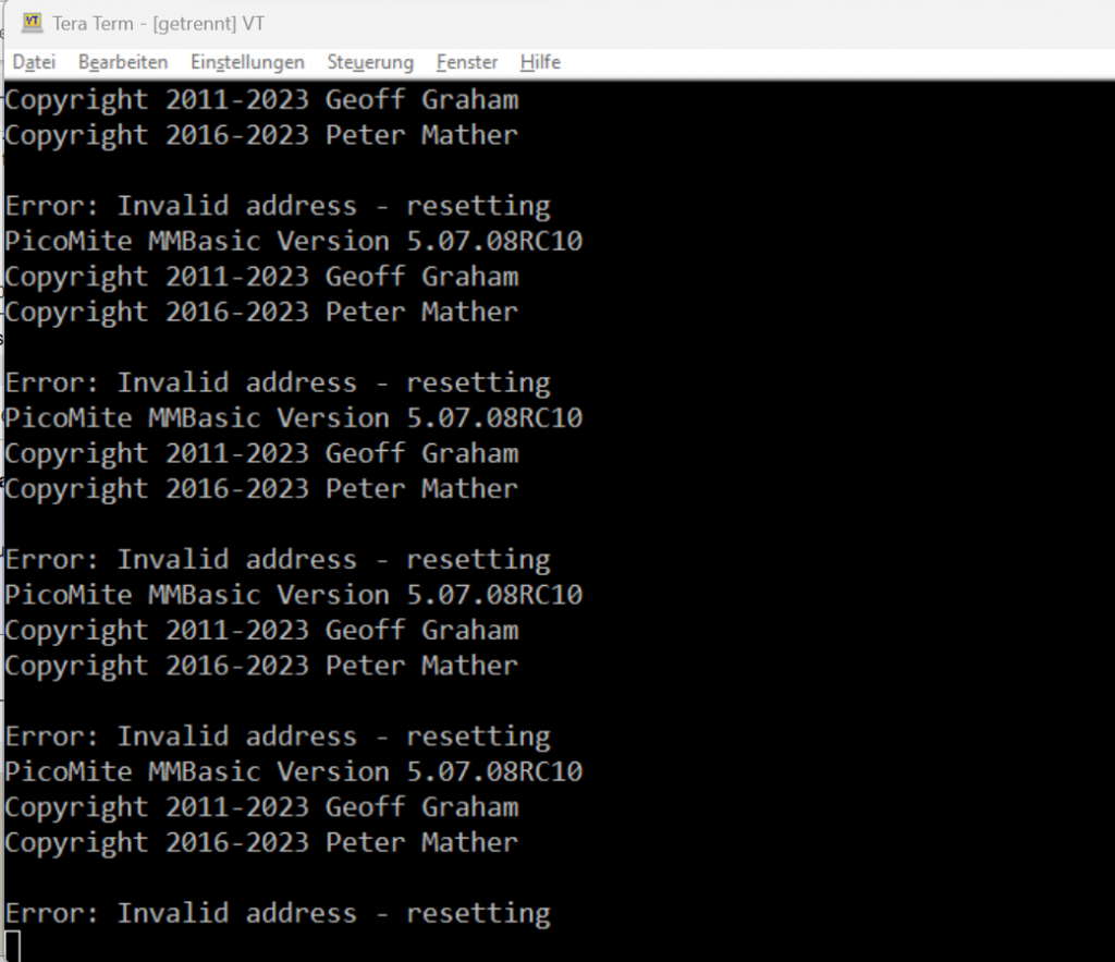Flash _ Clear has to be done every Time after it went to the endless loop. Just reflashing PicoMite doesn't help.
