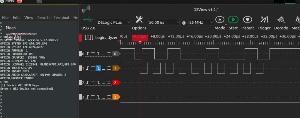 Hi, I'm attempting to connect a Wii classic to a pico, but I'm currently failing, I would just like confirmation that the signals I am getting on the I2C look correct, before I right off the Wii controller? I have tried with and without 10K pull up resistors, no difference, I always get the error:- [1] Device WII OPEN keys Error : Wii device not connected1 My options are displayed in the image, I'm using I2C on GP26,GP27, I have also tried GP16,GP17. In the image channel 0 upper GP26 data and channel 1 lower is GP27 clock. This is the whole trace, from when I run the test program, until it errors out. ![]() Thanks for any input. Regards Kevin. Edited 2023-11-29 02:26 by Bleep |