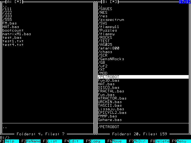Peter, If there is one thing from cmm2 that would be much appreciated, it is a way to browse the sd card. A filebrowser. Ideally that would be one that can also move, copy files ( a 2 pane browser like midnight commander. But the cmm2 browser is also fine, with its build in file associations. I remember there was midnight commander alike browser written in mmbasic for cmm2. Anyway… a file browser for picomite would be great. Regards, Volhout PicomiteVGA PETSCII ROBOTS |