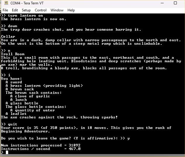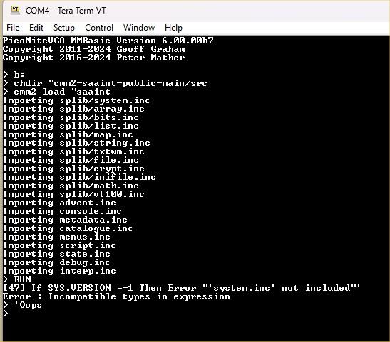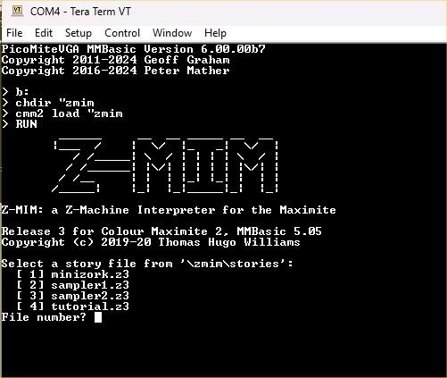 If the intent was to distract me then you did so at least temporarily. Nice additions. Looks like I'd left the SAAINT source code in an unstable state .I've done a quick fix for this and if you update your clone (you may need to do a forced update) or download a new zip then this problem will hopefully be resolved: - https://github.com/thwill1000/cmm2-saaint-public - https://github.com/thwill1000/cmm2-saaint-public/archive/refs/heads/main.zip HOWEVER when I last looked at it on real RP2040 hardware it would report OOM because its use of strings is very naive. It should easily fit (the original games would run in 16K), I just never got around to implementing more efficient read-only string storage. It may run unaltered on an RP2350. With regards Z-MIM I'm not entirely certain which memory-model you've built with, I suspect it might be the one where the entire story file is held in RAM, in which case IIRC the RP2040 has enough RAM to run "minizork" but not any of the proper Infocom .z3 story files. I'm afraid it is yet another thing I need to look at, my plan was to load the read-only parts of the story file into a flash slot. Of course I don't mind. I was holding off posting them myself until they were properly working on the Pico (if/when I get around to it), but I don't object to someone else posting if they want to. BTW did you get my email about LOAD BMP ? Best wishes, Tom MMBasic for Linux, Game*Mite, CMM2 Welcome Tape, Creaky old text adventures |