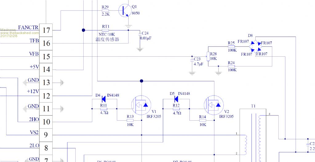 Hi madness. I think I'm on the trail of something with our inverter problems. Perhaps you could check along the same lines and between us we *will* solve this frustrating conundrum. Anyway, I just perused (again) the application notes for the EG1810. On page 12 under "AC Output Voltage Feedback" I found two things that are different on my PCB. The first "A filter inductor needs to connect to SPWM output port" I have not done that. Its not on the little EGS002 boards either and oztules also does not have them on the PCB screenshots he posted a while ago. Do you think that's worthwhile to investigate? If so, what size inductor? I think I'll get some of those little ones that look like a resistor and try them. The second, and IMO more important, difference: "voltage feedback is through measuring the AC voltage output of inverter." Here I just reverse engineered what oztules had on his PCB which obviously works. He rectified the output of the little 12V transformer. But then its no longer AC that gets sampled! I think the 8010 is looking for an AC waveform on its VFB (pin 13) input. Presenting the DC ripple of rectified AC 'might' work but it also might not. I certainly will now go and try that. If I am right then I will post an altered schematic here later and I'm sorry for not picking this up sooner. Now lets see what else I can find, I'm almost convinced something is wrong with the signals driving the gates rather than with the Mosfets themselves. Klaus |