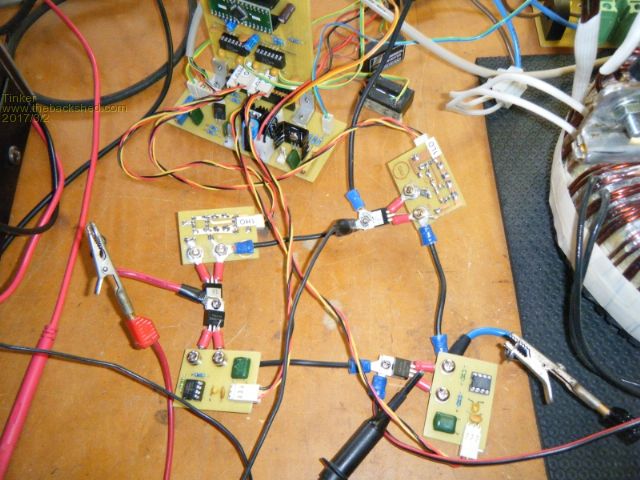 A bit more fun with testing today. First I rigged up My little gate driver boards to some 4110 Mosfet chips and connected the lot into a full bridge inverter. ![]() The close up pic below shows the little DC/DC converter blocks I use for the high side power (top right) ![]() Then all was powered up, voltage & current measured and I got a nice AC output on the scope. ![]() While I was probing around with the CRO probe the inverter just died suddenly. No bang thanks to no caps fitted and limited current supply. Turns out just one of the 4110 chips had developed a D-S short. No idea why. Replacing that one all worked again, of course with no load since there is no heat sink. So far I could not get it to fail again. It occurs to me doing a soak test for each chip might be a good idea, especially if there are 4 or more in parallel in the final inverter. So I'm making a little 4 chip test rig with screw type terminals for quick Mosfet connection. The 5mm spaced terminals will suit the HY4008 chips perfectly. No caps, no heat sink, just for checking the reliable operation and supply voltage endurance. Leaving each set of 4 on for a few hours, with many times on - off switching, should weed out the crappy ones. I think I'll continue using the gate driver chips for the HY4008 experimenting. Even the 4110's took the extra gate drive through a 1 Ohm resistor with no complains. Klaus |
