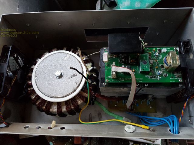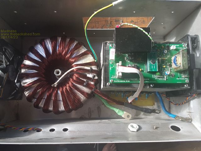 Here is the smaller Inverter I am building with the repurposed wire from the Toroid used as a new primary. This Toroid had a 250 Volt secondary and a 230 primary on the inside, I left the 230 to be the new secondary and reused the 2mm square wire X 19 with 24 turns as the secondary. With 230V on the secondary, I get 1.1V per turn. ![]() I was also able to reuse the piece I cut out for one of the fans to hold the Toroid in place with a piece of perspex under it for insulation. ![]() I thinking it should comfortably run 3 - 4KW continuos, FETs are 4110's I will see how the go but might change them for 4008's There are only 10 types of people in the world: those who understand binary, and those who don't. |