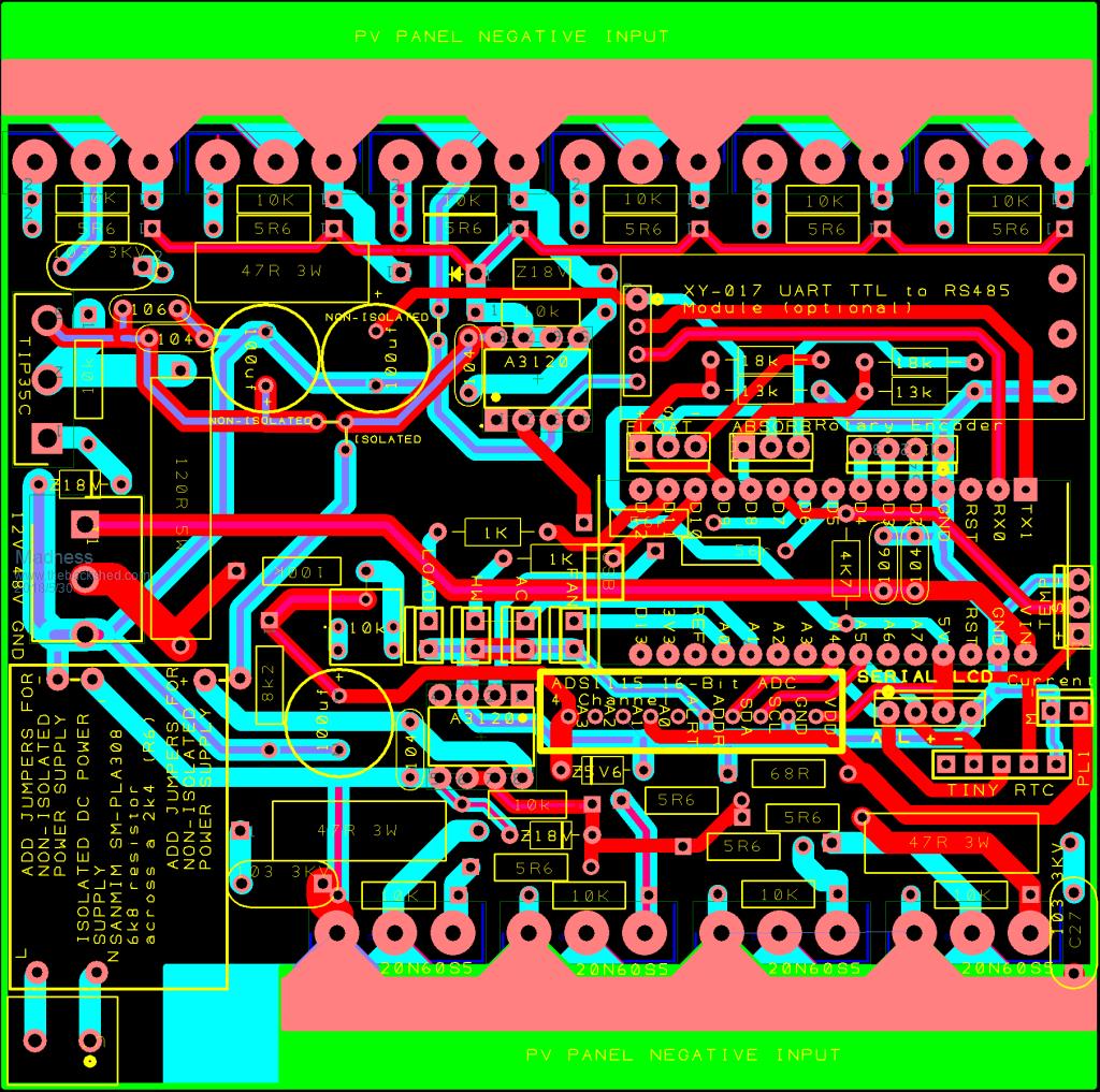 Here is what I hope is the final version of the Regulator PCB, I have just ordered 10 of these to test. It allows you to run it as a DC - DC PV regulator or to regulate a GTI back feeding through the off grid inverter or both DC - DC and a GTI. I have added a lot of optional extras which are not needed if you don't want them.