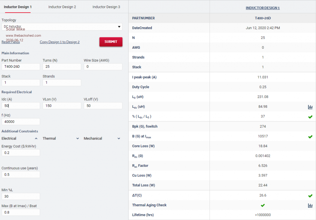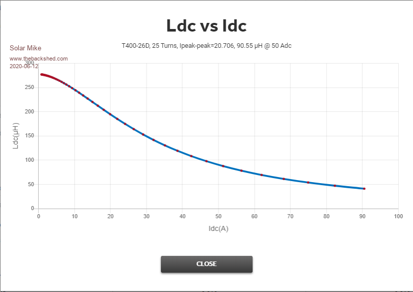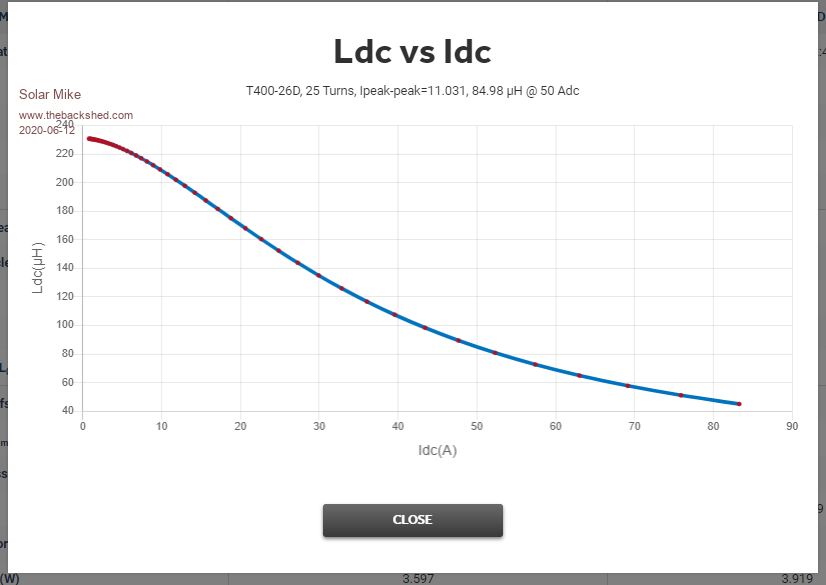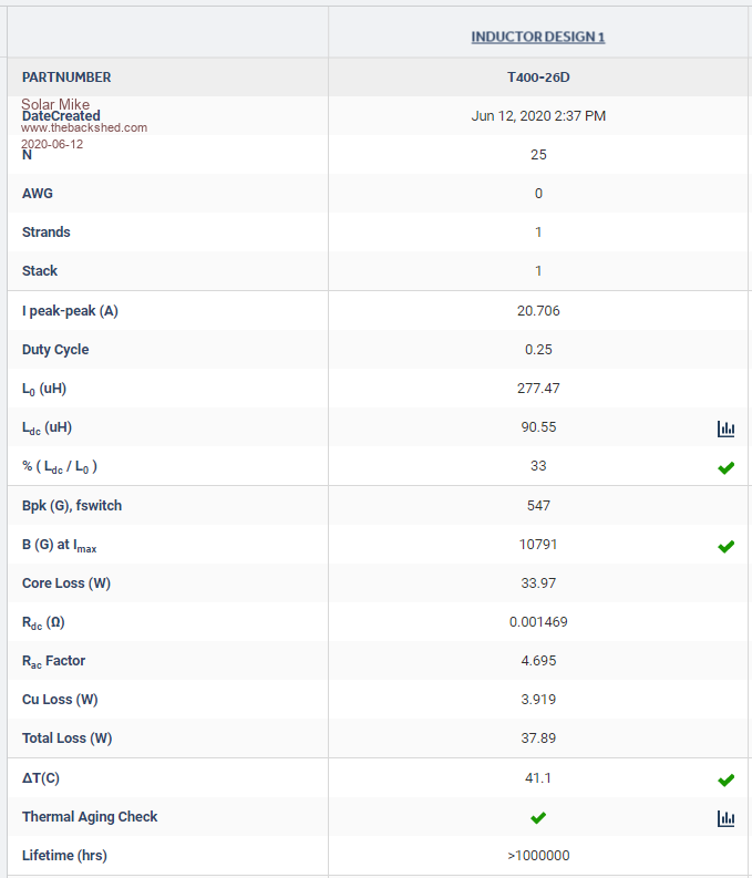They are really pushing the core loss with only 25 turns, 33.97 watts core loss, Wow ! And that is not just flat out, that ac core loss is there even with minimal load. The data sheet recommends 90mW per Cm cubed, and the volume is 171 Cm cubed or 15.39 watts core loss with that sized core. With 25 turns instead of 70 turns, that changes things rather a lot. They start out at 277.47uH and finishes at 90.55uH at 50 amps. My design starts out at 1.23mH and ends up at 193uH at 50 amps, and runs cooler too, but at anything over 50 amps, its going to be in real trouble with sudden death saturation. They really pushed the ac side of things to the limit. I went more for max dc and inductance. But it shows how a different design approach with different trade offs can produce totally different results. And yes, 25 turns at 40 Khz makes much more sense. Mosfet switching losses are going to be double at 40 Khz though. At 20Khz, I would still prefer less heat in both the mosfets and the core with more turns and a much lower minimum current where it finally goes discontinuous. Anyhow, some ideas for Peter to kick around. Just came back from about a three mile walk to the ATM and back. Thinking about all this, how about stacking a T400-26D with a T400-2D ?? The higher permeability -26 would give a very high inductance at low current. The -2 core would insure the combination would never be saturated, even if the -26 went to zero. The best of both worlds. It would be like having two very different chokes in series. For something that has to work over a very wide load range, that might be an interesting thing to try ![]() Edited 2020-06-12 14:57 by Warpspeed Cheers, Tony. |
