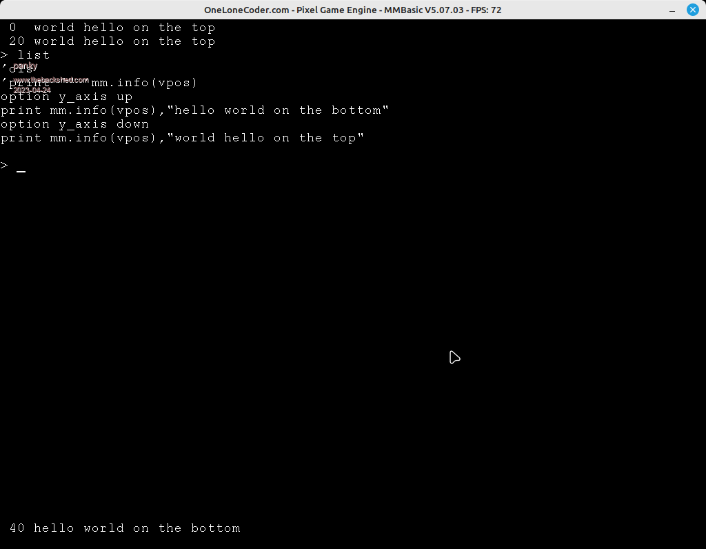 {QUOTE] When OPTION Y_AXIS UP is in effect, PRINT does nothing. It works OK for me. Note that the "You wont see this" is at the bottom of the screen. Try MODE 1 for an 800*600 screen to ensure that its not just that your last line is not visible. Check your have not scaled the font above 100% in windows settings if the bottom line is not visible. F4 H7FotSF4xGT |