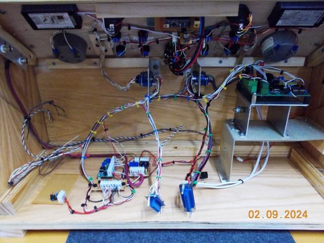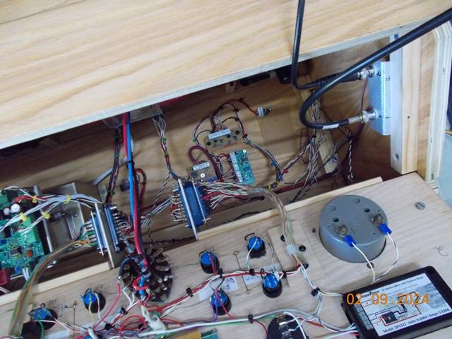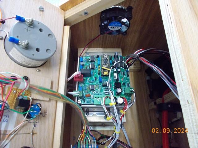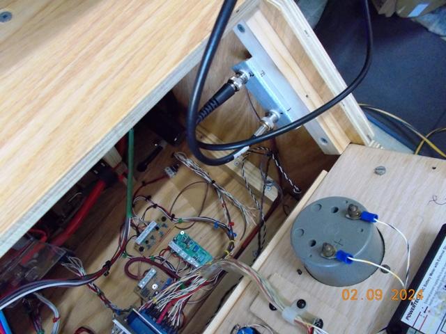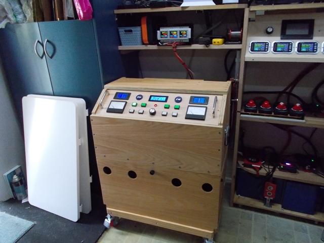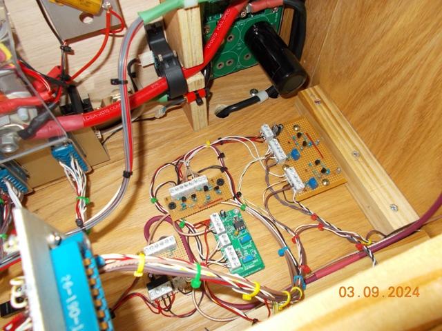 There is not a lot of difference between the old single power stage inverter waveforms and the dual power stage inverter waveforms. Dual: AC holds it's wave shape when a 13kW load dumped on it. Single: drops a bit more, has a big disruption at load start, can skew slightly. Dual: AC recovers to set output in a few cycles. Single: Takes up to twice as long to get close to full AC. Dual: AC current waveforms are very good (half total current in each stage). Single: Almost matches, pretty impressive as it's hitting a full 540A DC input. Thoughts: This just highlights how powerful a single wiseguy inverter is. It means that a dual stage inverter could easily handle over 1000A peak DC input I had to rewire the cabling to the Hall sensors - I had a lot of switching noise on one sensor. I had gone to great lengths to keep 53V and AC sensor signals out of the cabling, even running a separate 5A 3-pin plug in cable from 53vdc input bus, precharge resistors and Kilovac coil enable line directly to the power switch. Anyway, I made the change last night and tested this morning - YES fixed.I have two BNC connectors for two 500A Hall effect current clamps for easy monitoring of DC input currents for each power stage with a Digital Storage Scope, those sensors are accurate to over 750A each. The BNC connectors are hidden behind the front panel, I thought this was this best solution as the font panel simply lifts forward to gain access, and the front panel can sit back against them when testing or capturing startup data. The messy cables and Veroboard on the bottom right of the cabinet are for the last of the sensor indicators and AC current trips. Nano control board, a tiny fan to keep air circulating through the control cabinet. 20 seconds after the pictures above were taken, here is the upper cabinet on the bench ready for adding the last AC current sensors indicators. _ Edited 2024-09-02 12:07 by KeepIS NANO:Inverter V 8.2ks - Linux AvrDude GUI script V4.1 |