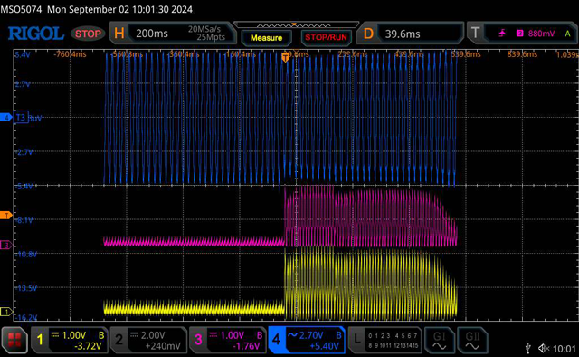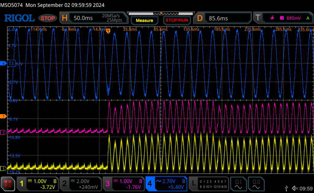 The inverter starting the BandSaw. Blue: AC on the Mains some distance from the inverter Magenta: Power stage 2 current Yellow: Power stage 1 current Start up current 235A on each power stage, total peak input 100Hz waveforms of 470A. ![]() The lower waveform currents are identical, just a bit more noise on the lower. ![]() Zoomed in on the initial startup. The slight humps on the left of the screen are the normal Inverter load running currents of around 600 watts each (1.2kW) prior to powering the BandSaw. BTW This 2 meter high BandSaw is not a big load when compared to other workshop equipment. ![]() _ Edited 2024-09-03 09:31 by KeepIS NANO:Inverter V 8.2ks - Linux AvrDude GUI script V4.1 |