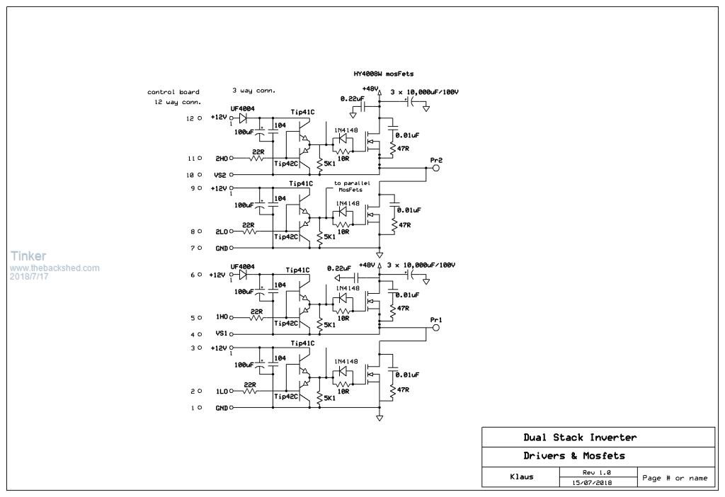Today's testing had the little inverter doing 2700w with just 4 Mosfets. No problems at all. I have now fitted all 12 Mosfets and am waiting for a really sunny day so I can test just how far I can push that thing .Now to continue with the build description. Looking at the power board schematic below it is obvious (to me at least) that there are two *identical* circuits to it. So it made sense (to me) to have the parts located on two smaller, identical, PCB's. Since 2 oz PCB'a are expensive anyway and the larger they are the more $$ they cost its a win win. As there is a minimum order quantity from the board makers, having two instead of one board is no problem. Also, I found it much easier to lay out the smaller board on the laptop screen. A downside might be one cannot use that ribbon cable for the gate drive signals but for me its not a great idea anyway. I much prefer individual wired gate drives, no long tracks on a large PCB. ![]() So this is what my power boards look like, shown top & bottom side of one board. As mentioned, there are two of those boards used. Components are soldered onto both sides of the board. I used extra solder lugs at the capacitor terminals for beefing up that area. The power track vias have been filled by soldering 1mm tinned wire links in to raise the current capacity of the vias. The alternative was to have dozens of plated through holes for which there was not enough room. ![]() Looking at that picture you will notice something odd with the solder resist screen. I fess up, I goofed there . Somehow the Gerber files ended up the negative image of what I wanted . The board makers tell me the resist layer will not come off without damaging the tin plating.But the board is perfectly usable, I just cut small thin washers from solder lugs and placed them where the screws pass through the board. These are high current areas, I made sure I got tin plated copper lugs - they also sell them in brass, tin plated, which look exactly the same. The component silk screen is a bit meager, the free PCB layout program (Design Spark) does have an extensive library but its linked to the foot print of the part manufacturer. So the pad sizes, spacings, etc. are a bit too crammed for a board with relatively few parts on it. I prefer to have bigger pads and wider spacing that can stand up to de-soldering... So, no "painting by numbers" here. I think it is better having to follow the schematic & tracks to locate which part goes where, this should help a lot for understanding how everything connects together. On this board there are screw terminals used for the Mosfets as well as for the totem pole drivers. ![]() Note how the totem pole transistors are oriented and held together by a 25mm plastic spacer. The latter is to prevent constant bending of the 'legs' when the board is handled. The legs are bent to insert into the terminals, they were oriented this way as it made the resulting PCB track layout much easier. There is a 3 way pin header located between the totem pole drivers, its where the gate drive connector goes. The boards are numbered 1 & 2. Each has a high and a low side. So 1LO means low side board one. 1HO means high side of board one. I marked the plugs accordingly since each gate lead has the same length wires. ![]() The Mosfets connect into vertical terminal blocks. They provide excellent access to remove or insert the part. However, it can be seen that the back of the terminal is open, so I located them a little further from the heat sink to prevent flashover at magic smoke events. There is a 25 x 6 mm alu strip spacer to compensate for that. I also stuck a strip of klapton tape to the terminal underside (against the PCB) for the same reason of flashover minimising. Prevention is easier than cleaning up the black charred mess. However this has not been tested yet, so far the inverter behaves admirably .Since the power PCB directly screws onto the heatsinks, the mosfet legs do no heavy heat sink supporting duty at all. One or even all at once can be replaced quickly and everything else stays in place. Perfect for the experimenter .A hint about soldering components. I always start with inserting the lowest height parts first. This is so when the board is turned over for soldering these they all remain pushed against the board. I don't use those PCB holding contraptions. ![]() I only slightly splay the 'legs' so the part remains on the board when turning it over for soldering. For a good mechanical fixing the legs should be turned hard over and cut at the pad edge. Very essential if the board is subjected to vibrations. But for me, where on occasion a part has to be unsoldered, such a method would make that unsoldering difficult. So I leave the leg intact for soldering. This also prevents semiconductors from getting too hot if one is a bit slow with that soldering. The legs are cut after soldering, this also assists when checking if each leg is indeed soldered since one has to look at it to place the side cutter. When soldering multiple pin parts, like DIL sockets, I always solder a corner pin on each row, at opposite ends, first. Then I turn the board over and check if the socket is indeed flat against the board. If it is not, its easy to apply the soldering iron to the pin soldered while pushing the socket in by finger to correct. Quite impossible to do if many pins were soldered on each row. Here is the completed control board. ![]() I will describe in detail how I test this later. It may be noted there are extra pin headers next to pin 1 of the EG1810 carrier. They are for dead time selection my means of placing these 2 pin shorting plugs over the selected pins. My board can accommodate two different row spacing EG1810 carrier boards, I think the one madness did is uses the wider carrier board. Those blue 25 turn trim pots is what I prefer for this project. They allow a very fine adjustment and have a very small footprint on the board. They're sealed too. This boar