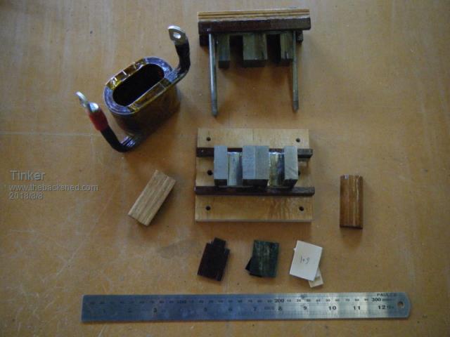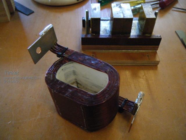 The two half dowel sections shown were used to wedge the rounded ends of the coil in place. The coil must be locket firmly in place but, for experimenting, epoxying it in solid would make it no longer possible to change the gap spacers or to disassemble the lot.
