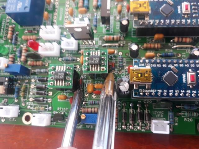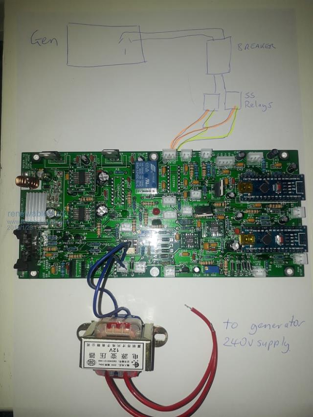 First need to make sure of the phase of the "mains" or generator sync input. The inverter will sync up and we need to see if we guessed the phase wiring of the 240V-12V transformer correctly. I posted before how to find out safely.