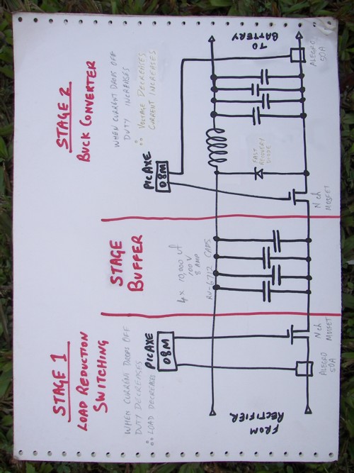 Now that we have a generator with Volts and Amps that track the wind power, it must be applied to a load. If a resistive load like a heating element, nothing further need be done. For battery charging, after cut-in is achieved, the excess volts go to heating the stator coils and rectifier and are lost to our battery. We can recover this lost potential and convert it to even more current. Here I've used the the simplest form of Buck Converter(because I'm dumb with limited knowledge) to do this task. I imagine Solar MPPT are designed to a more sophisticated standard by the professionals. Whilst they do the same task of this second stage, Solar MPPT do not have to contend with the much higher range of voltages delivered by a wind generator. The result of buck conversion is that the Amps through the freewheeling Diode sub-circuit and the Allegro Current Sensor are higher than those of Stage 1. The monitoring of these amps by the PicAXE allow it to adjust the pulse width to a peak and ever changing value. An even better understanding of Stage 2 can be had from this ZIP.
