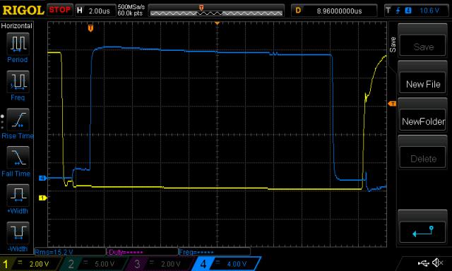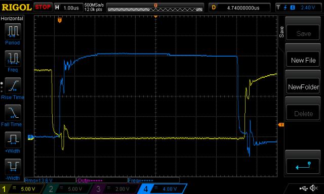 Further to running the Powerjack inverter from the Madness control board: When running this at 52V, the idle current is 1.5A with the Madness control board. I tested it using the PJ control board and the idle current is 0.38A These 2 tests were using identical choke, toroid and capacitor, producing 230V AC. 0.38A for the PJ control board, 1.5A for Mad control board Why? I had a look at gate drive voltages, at the PJ power board screw terminals, since they are so easy to gank into with short wires for the oscilloscope probes. Here is the low and high side when running under the PJ control board. Yellow is low side, Blue is high side. Nice and clean control, no shoot through. Well, not much anyway. Notice the 2uS dead time. ![]() There is some, but since the gate voltage does not rise high enough to conduct for very long, it's not a problem. Here is the same signals, but this time running under Mad control board. ![]() Lots of shoot through. Clear evidence of the oscillations induced by these high energy events too. This is using a 500nS dead time. Increasing this to 2uS will NOT in my opinion alter the degree of shoot through. This is because the shoot through is caused by dv/dt, not poor gate drive timing. I do not recommend you run the PJ inverter with the Mad's control board. I think it's not a good matchup. At this stage I will not send the board to you now. The problem of how to convert a 240V AC PJ to 120V might be easy enough. Maybe you can drive two toroids, one having a 240 output, but small. And one having a 120V output, and huge. Retain the 240V toroid so as to give the PJ control board the needed 240V AC voltage feedback. That is it's only job. Place all the loads on the 120V AC toroid's secondary AND accept that in some cases you will see the voltage droop a little. You plan to put 2-3kW through it. At 50V that's 60A DC and with long shoot through event duration, I think you probably will blow it up. wronger than a phone book full of wrong phone numbers |