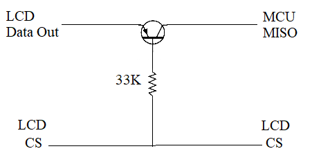 " it only enables the DATA OUT pin to pull the line high when CS is low, when DATA OUT is low it is not actively pulling the line low. A pull down resistor (to 0v) on the transistor collector would help." I think mine works without the pull down resistor because the emitter can act as a collector and vice versa, with much reduced gain. The reverse beta is typically around 1/10 of forward. This only works at low voltages as the B-E reverse breakdown voltage is only 6 to 8V. If you do use a pulldown resistor perhaps it could go to LCD-CS instead of 0V. Tried it on mine and it works as before. |