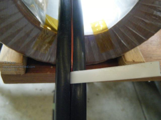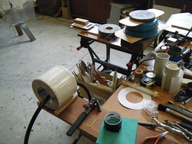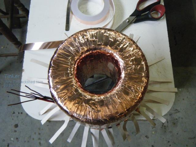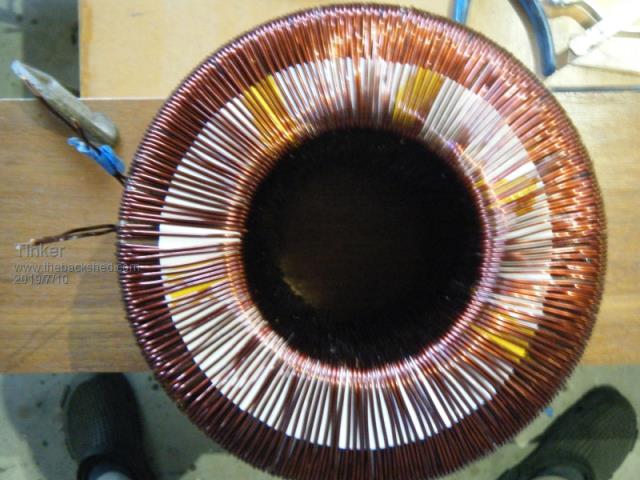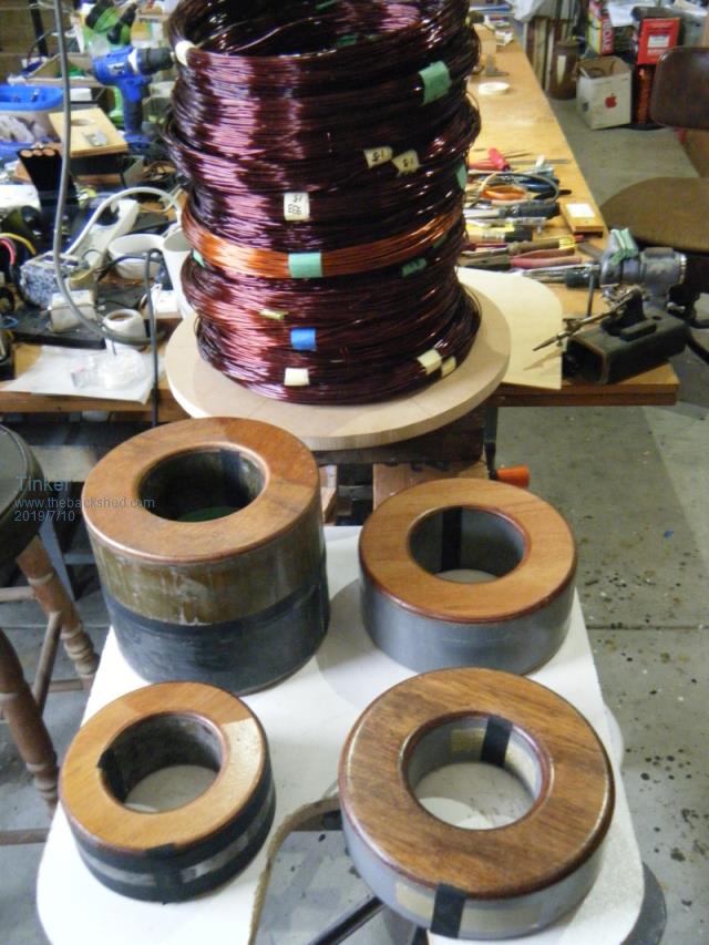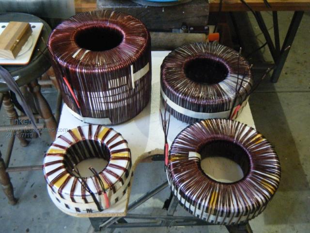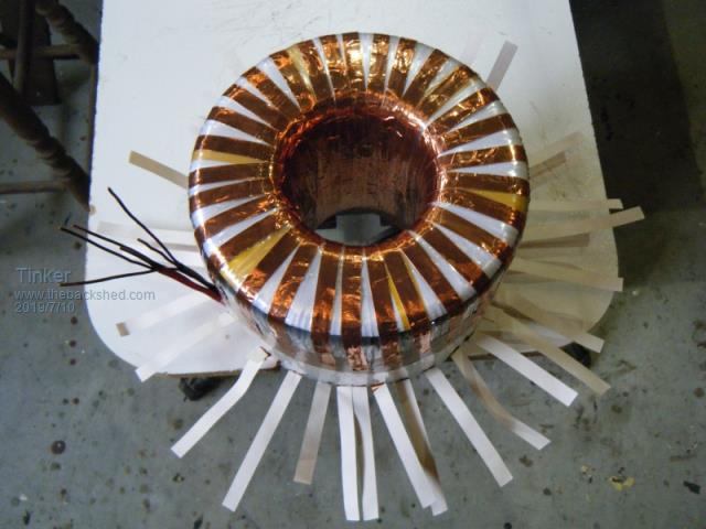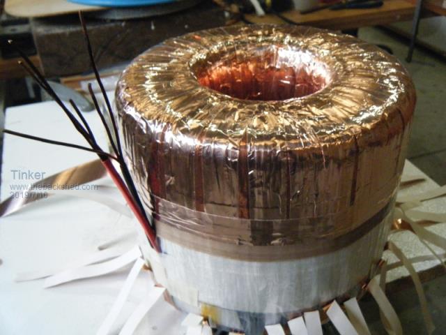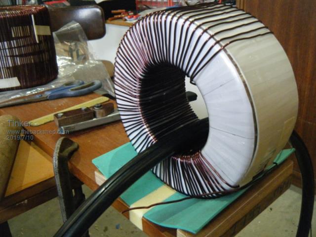 Andrew, the solder reel method is doing it Flinders island style , I prefer to copy the method commercial toroid core winding machines use.I also found it much easier to wind the cores lying sideways, the complete turn can then be inspected without having to lift the core. Yes, its 19mm black poly pipe. My 600mm dia hoop can hold 1kg wire easily. It did the whole winding on transformer 2-4. The recycled wire was too short for the double stack No. 1 transformer so I had to fit one splice at each of these secondaries. The hoop could do the whole winding if my wire was long enough... Klaus |
