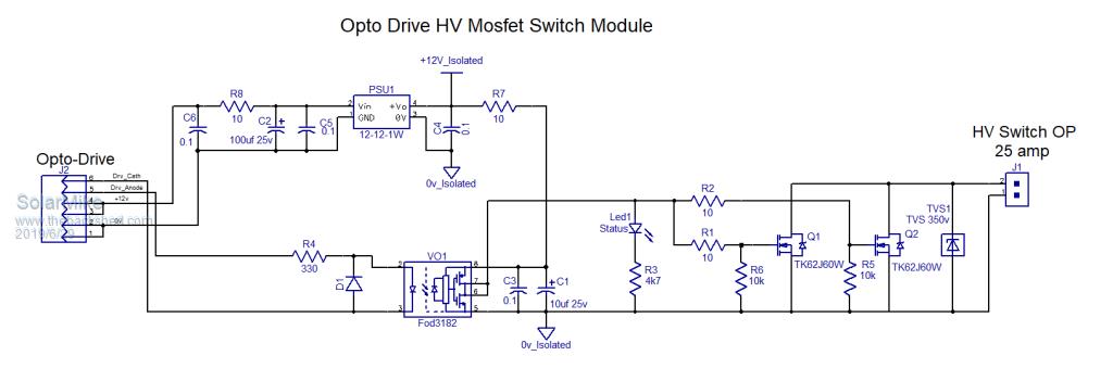 First up is a simple High voltage switch module, using opto mosfet driver and an isolated 12-12 volt psu, Have allowed for two parallel mosfets, switching rates will be around the 50 - 100 hz so design is simplified somewhat. This module can be connected to the main dump capacitors and a driver to power the element. Sorry about the smd components, don't use anything else for low power stuff...