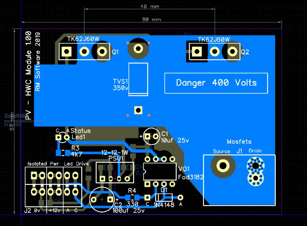 One of the things I would like to experiment with, is to make a full bridge using 4 of these modules and allow the polarity of the HWC element be switched to further prevent arc's forming on the thermostat contacts. I fear if the on duty cycle gets too large using a single mosfet switching the element, then there won't be enough time when the switch is off to suppress an arc.