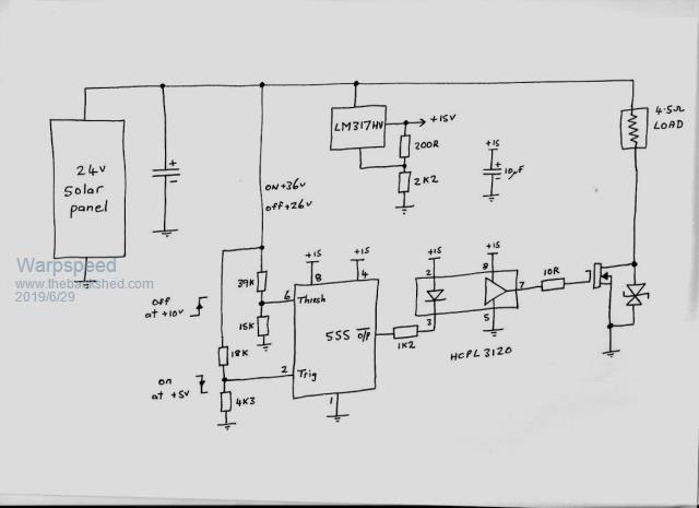 Looking back at my testing of a single 200 watt panel, threshold voltages of 26v and 36v seemed appropriate for that, and I bread boarded this: