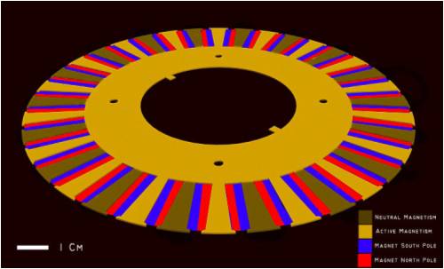 I have included the rotor I have designed (last image below) with the proposed positioning of the magnets. I have kept the scale of the rotor within the dimensions of my stator which is being restored at this moment. The current thought is to purchase 36 neodymium magnets (N45) at 5mm x 20mm x 20mm for each rotor. The cost being met by recycling copper from old motors I have stripped. I may have several (first image below) individual rotors (coloured black) fixed to the one axial shaft (coloured green), with the thickness of each rotor being determined by the depth of the magnets (a rotor 40mm deep/thick would require two sets of magnets, which would make a total of 72 magnets per rotor) arranged in the following manner... The last image below shows the positioning of the magnets for my rotor. I found a link on this or another forum to 3d software "freeware" that helped me design this image... design software here