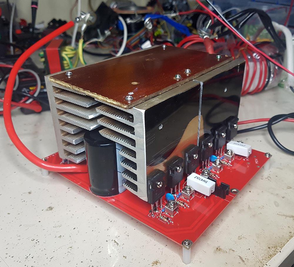 Mark and Madness: I've just built my power board using the smaller version that Madness designed and sells (the 12 FET 4kW board) Advantages: fast to build, not needing lots of parts either. just 12x resistors,diodes and 4x snubbers. Compact too. It's a good soldering PCB as well. I used the offcuts from the large Mad board I built for heat sinks and it works out perfectly (one 3kW Aerosharp heat sink can do both power boards) problems: none at all. The 4 10,000uF caps are a bit tight to fit but I ended up using only 3 of them, to permit the 4.7uF cap to fit in there as well. I will refit the 4.7uF on the bottom of the PCB, then all 4 bulk caps will fit. Here is how it ended up: ![]() Waveform at idle is very clean and under 200W load becomes a perfect sine. Here is idle: ![]() I estimate efficiency (51V DC supply, 200W load) to be about 93.5% With the 3 bulk caps fitted, under the 200W load I saw only about +/- 250mV ripple on the DC supply. These caps are doing a great job. I like this board a lot. And my measure of quality is idle current. (I am obsessed with shoot through...) When driven by the nanoverter, this combination has the lowest idle current of anything I have here. This means smaller shoot through and/or better gate drive rise and fall times that minimise switching losses. I think I can make a 1500W 50V inverter that uses only 10W at idle. wronger than a phone book full of wrong phone numbers |