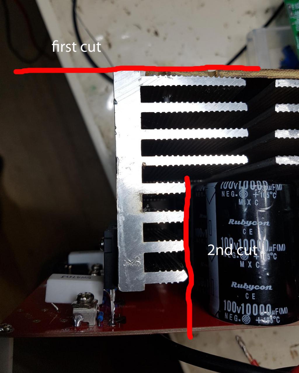 Mark, I sliced the 3kW heat sink lengthways, "1st cut" in the image. Then I shortened the lower 4 fins, "2nd cut", cutting the now two narrow slices. This gave me 2 long heat sinks that fit well and leave ample room for cooling air and bulk caps. I needed one long and 2 short lengths of this stuff for the large totem pole Madness power board. Some remained after I cut what I needed. Two lengths of about 150mm remained. These two lengths are enough to fit the 12 MOSFET smaller power board Madness sells. ![]() wronger than a phone book full of wrong phone numbers |