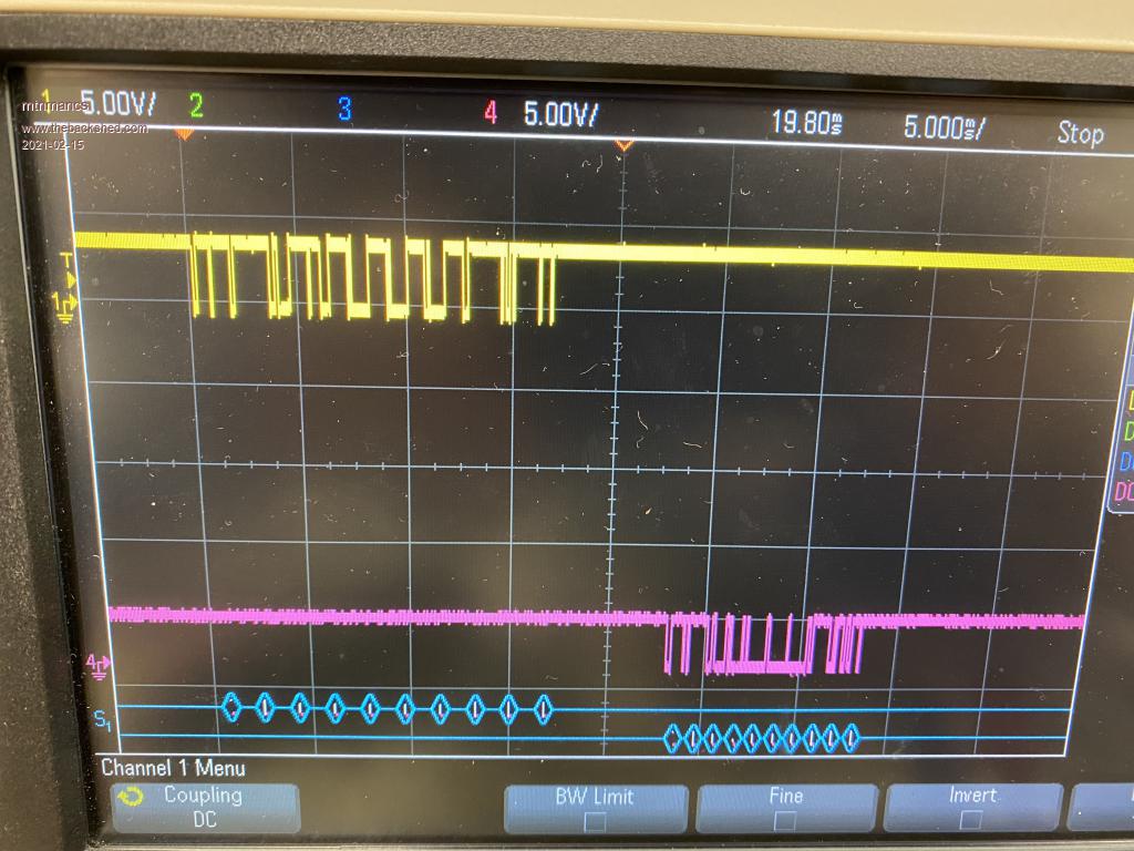 First, here is TX and RX on my YX5200 module. Input to the module is obviously channel 1 (yellow) and output from the module is obviously channel 4 (pink). Sorry about the dust on my scope screen! Note that the output swings about 3.3V with nice clean transitions. You can see my serial decode at the bottom of the screen, although I haven't zoomed in enough for you to see the bytes. The point is simply that the scope's serial decode is properly decoding the bytes at 9600 baud.