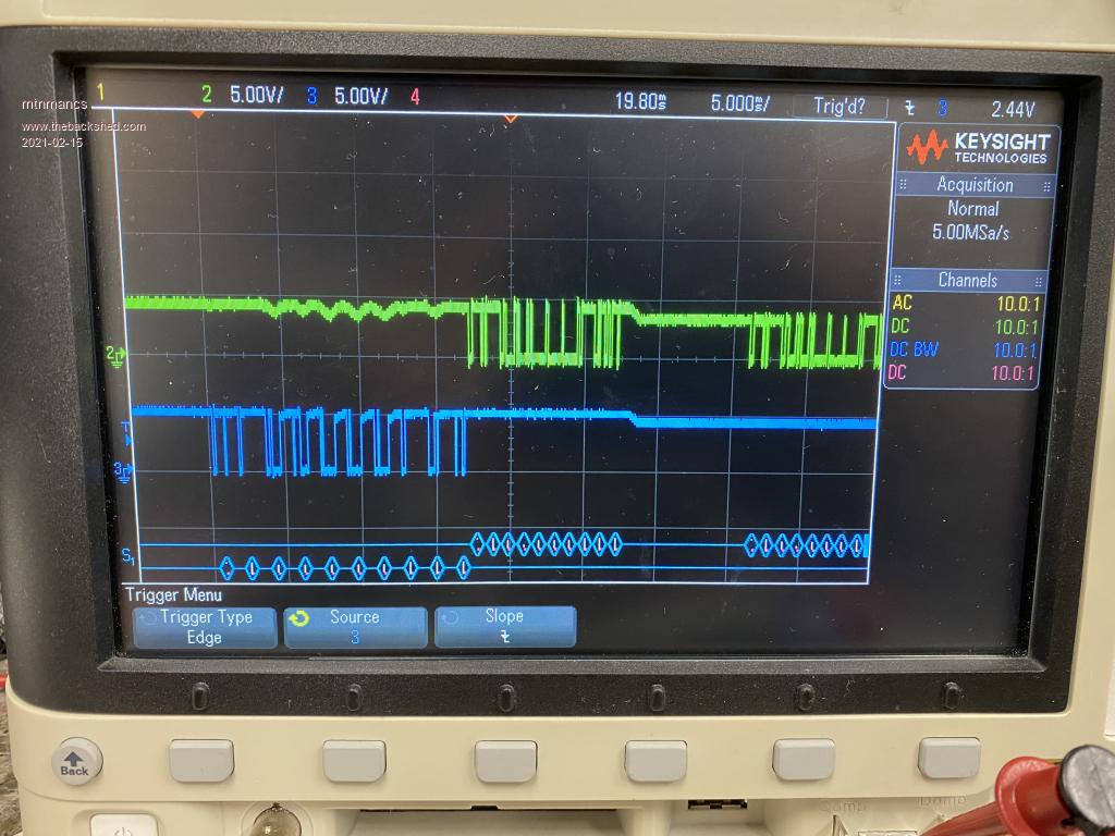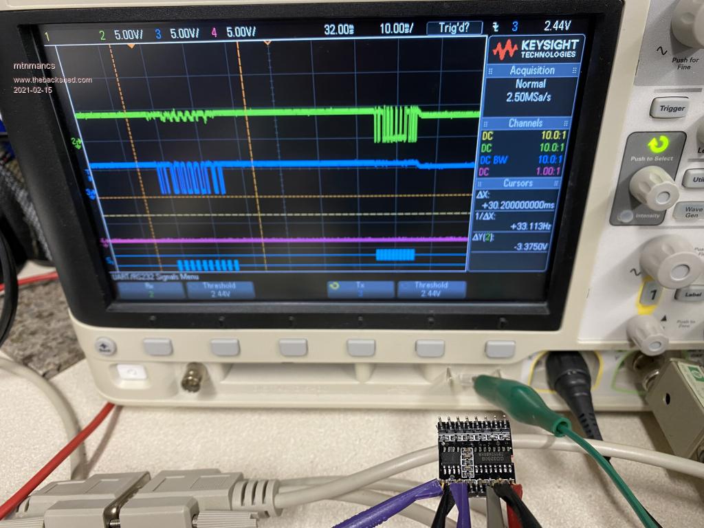 Next, here is TX and RX on an MH2024K module. Input to the module is channel 3 (blue) and output from the module is channel 2 (green). Note that the output sometimes swings 5V (for the first packet) and sometimes 3.3V (for the second packet). Also note the coupling from RX to TX during the time when I am transmitting to the module. Also note that the transitions are not as clean (on both TX and RX).  It's pretty clear to me that this module's IO isn't really designed to work with a 5V supply. Note that serial decode on the scope is still working fine.