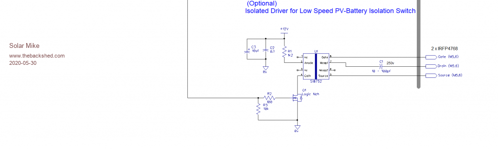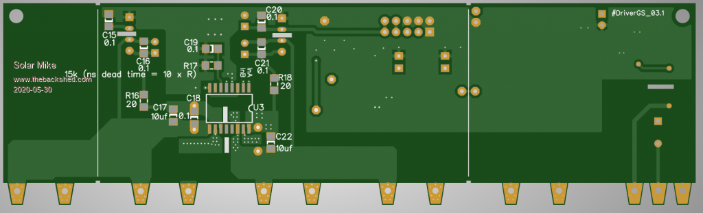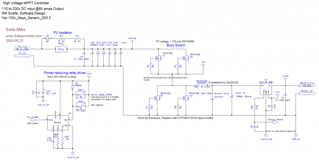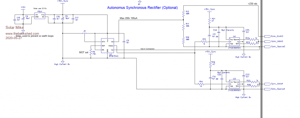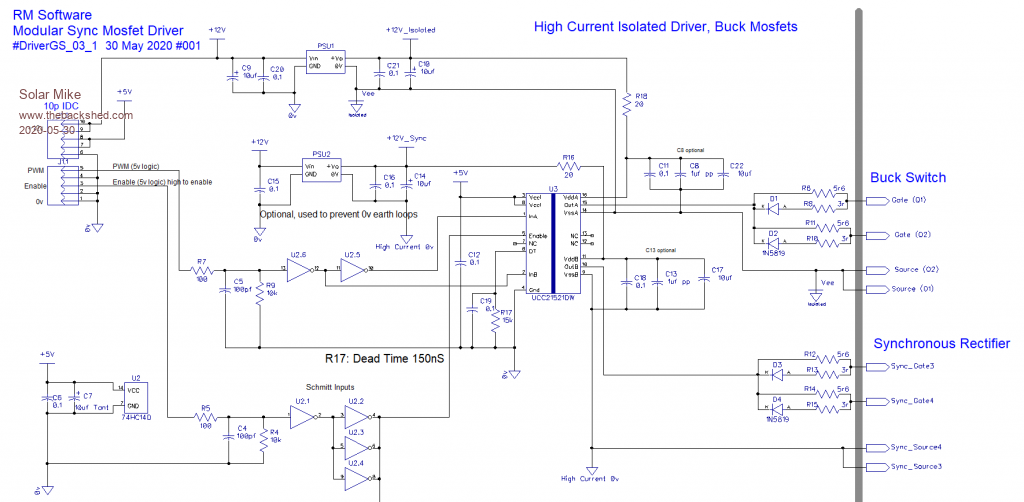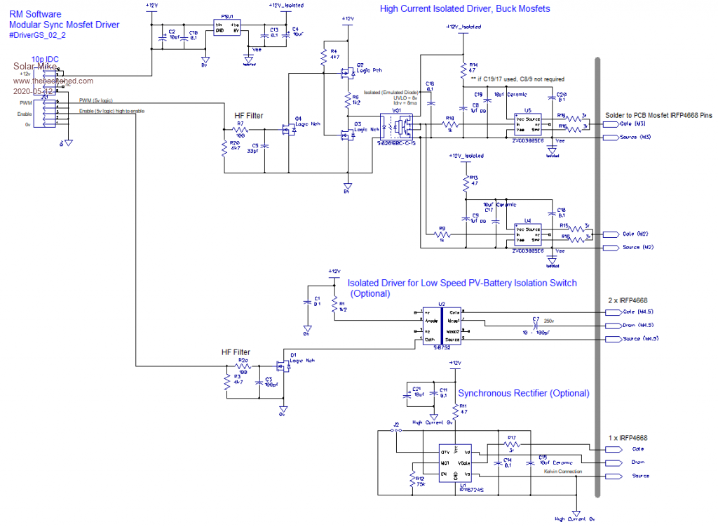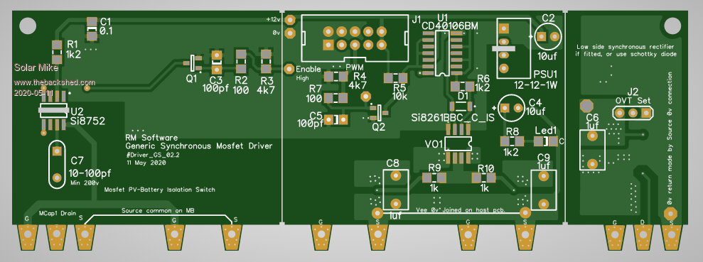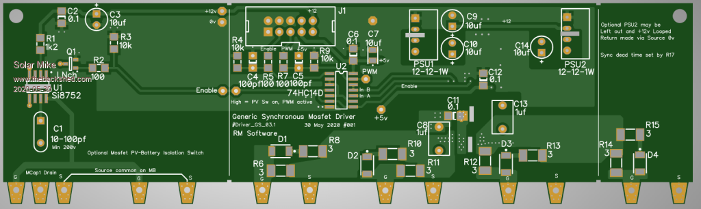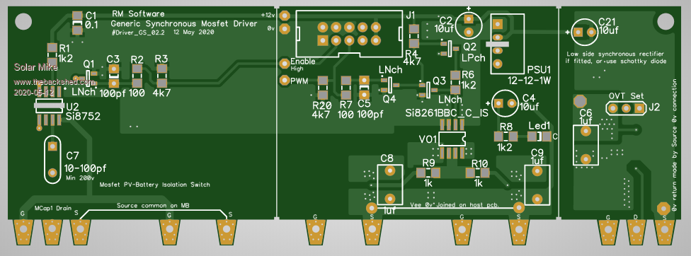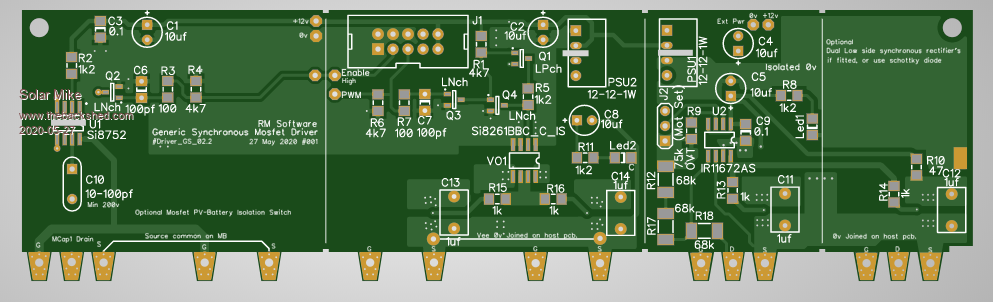 The pcb has the functionality such that the buck driver may have the optional sections simple cut off with tin-snips. In light of the work Poida is doing, the mosfet PV isolation switch may not be required or replaced by a relay. The synchronous rectifier section similarly maybe chopped off if not required and a schottky rectifier used instead. Rather than send off multiple board designs its easier to do it on one.